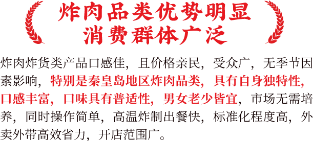 如今,我们定位于“中式炸肉开创者”,传承中国炸肉,秉承初心不变、品质至上的理念,推出一系列兼顾老顾客与年轻人口味的新美食,吸引本地居民和外地旅客前来品尝,感受秦皇岛炸肉魅力,树立秦皇岛炸肉地标型品牌。